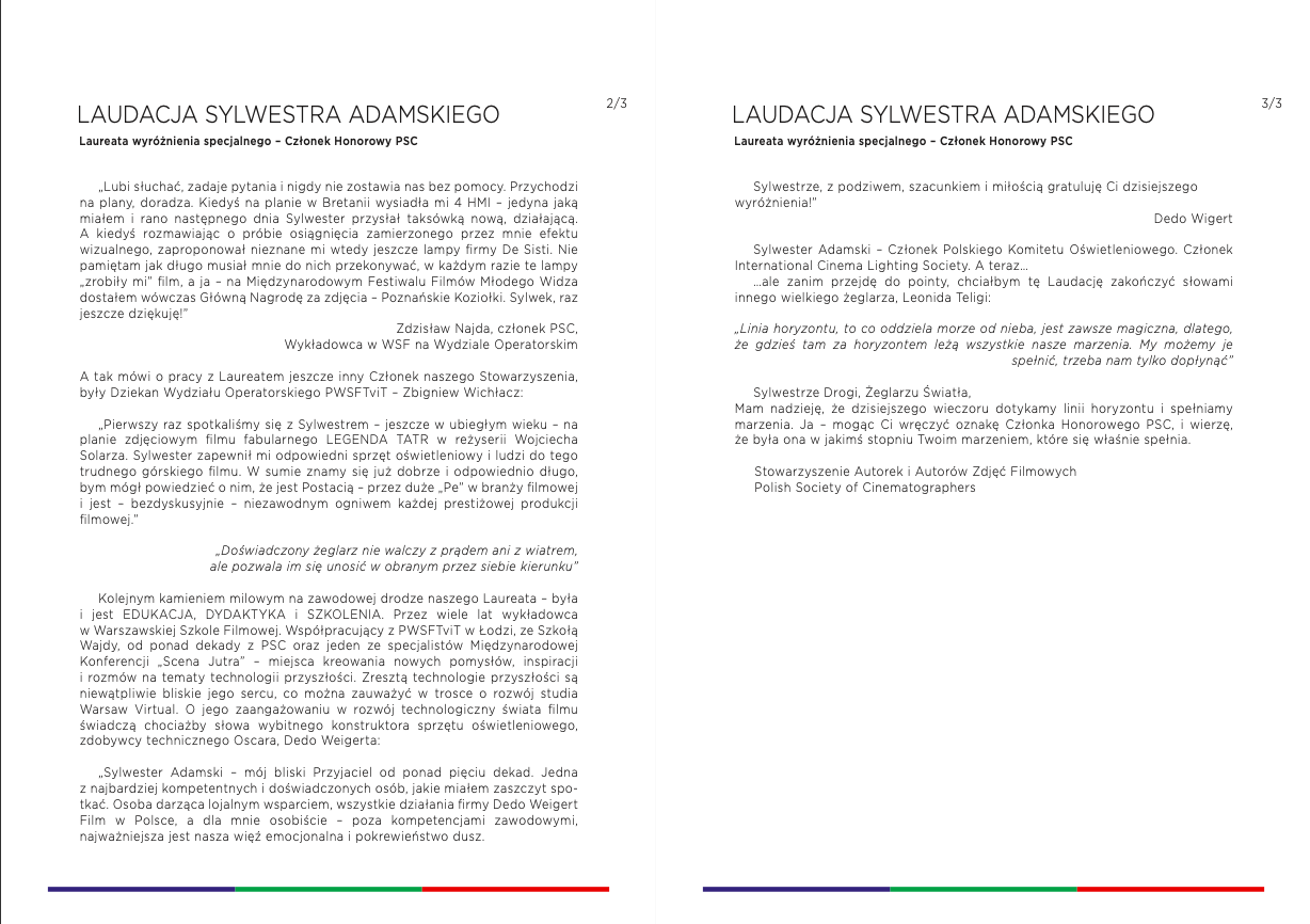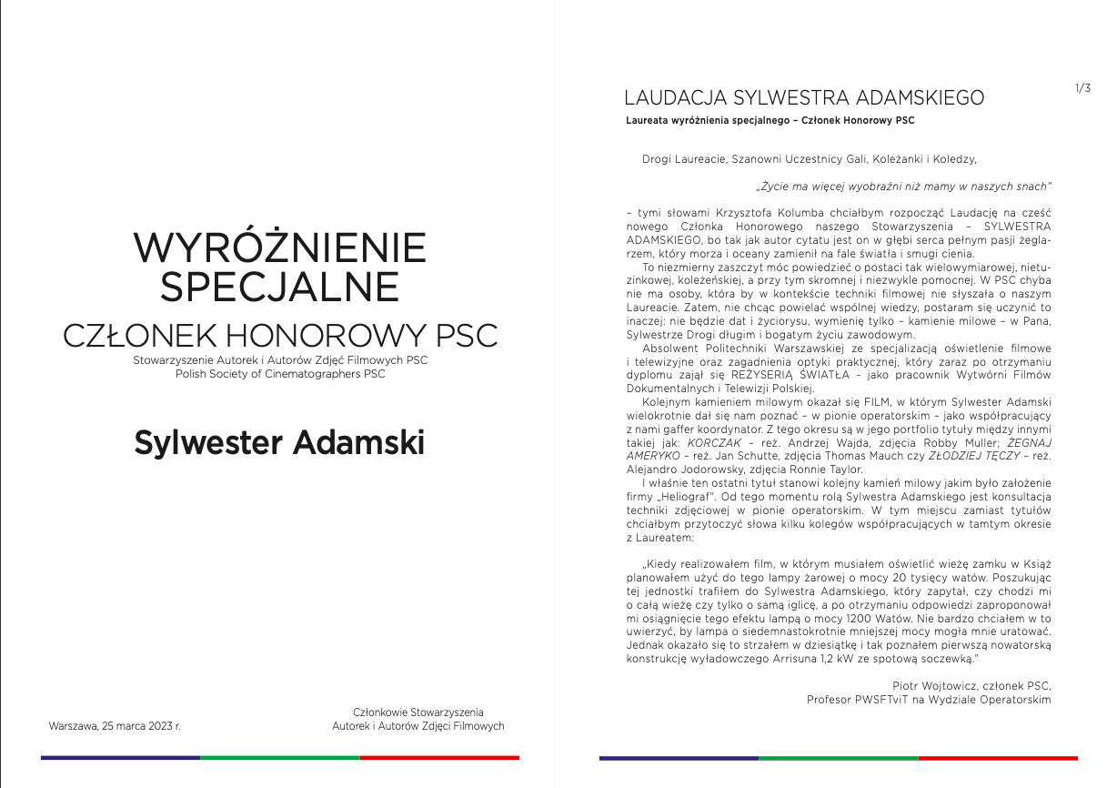 W Laudacji wygłaszanej na cześć Sylwestra przez Członka Zarządu PSC Artura Żurawskiego mieliśmy przyjemność między innymi usłyszeć: „To niezmierny zaszczyt móc powiedzieć o postaci tak wielowymiarowej, nietuzinkowej, koleżeńskiej, a przy tym skromnej i niezwykle pomocnej. W PSC chyba nie ma osoby, która by w kontekście techniki filmowej nie słyszała o naszym Laureacie.”